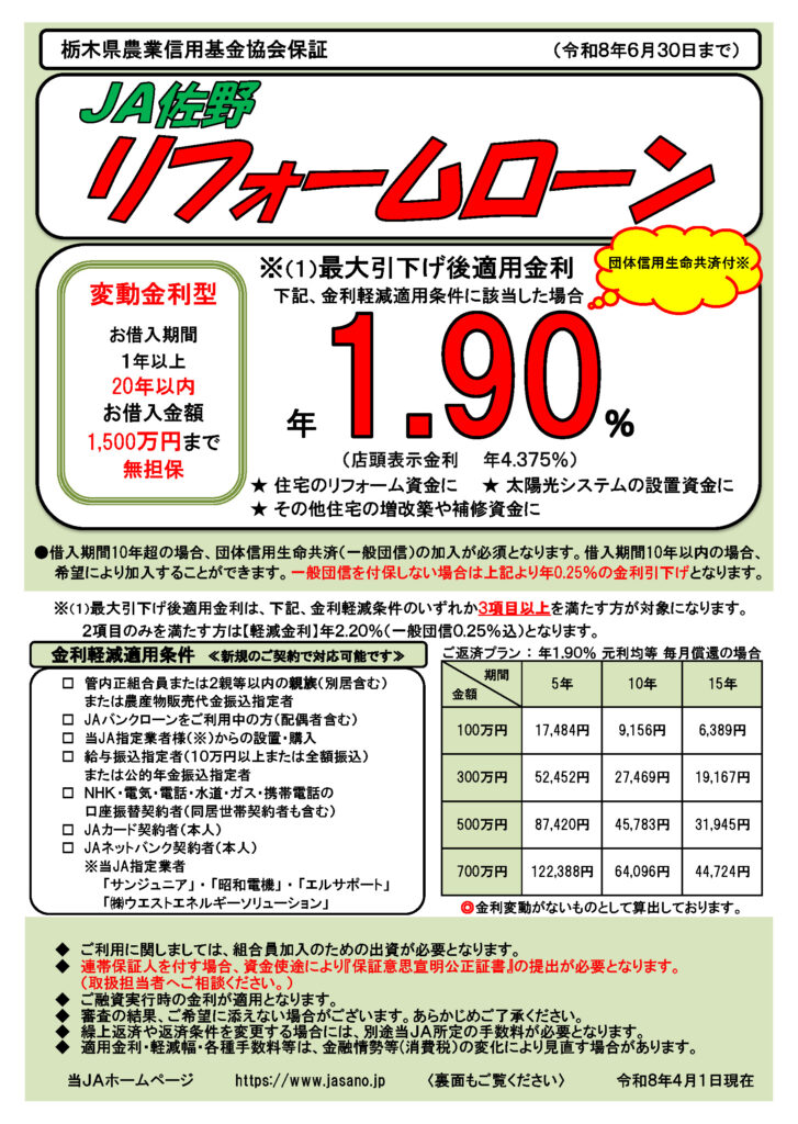 栃木県農業信用基金協会保証 リフォームローンキャンペーン